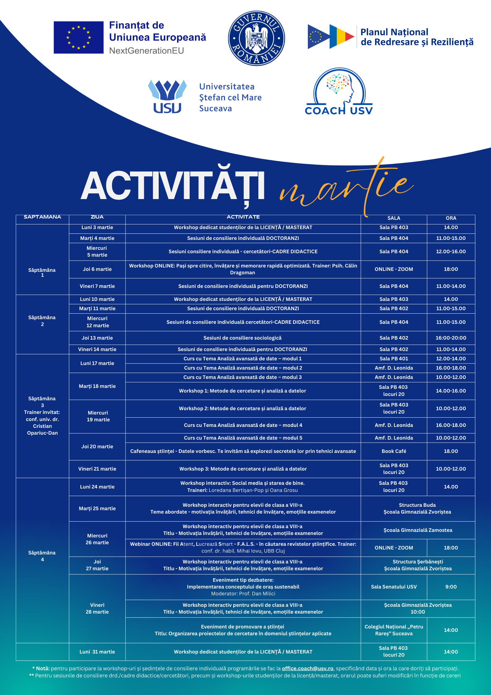 În luna martie 2025, Centrul COACH-USV a programat o serie de activități dedicate elevilor de clasa a VIII-a care urmează să treacă prin examenele de la Evaluarea Națională, studenților de la nivel licență, masterat, doctoranzilor, cadrelor didactice universitare și cercetătorilor din Regiunea de N-E a României, printre care: sesiuni de consiliere de grup pentru studenți (licență/masterat), consiliere individuală pentru doctoranzi și cadre didactice-cercetători, cursuri și workshopuri aplicate pe analiza avansată de date și metode de cercetare (trainer invitat conf. univ. dr. Cristian OPARIUC-DAN, Universitatea „Ovidius” din Constanța) sub titulatura de „Săptămâna Statisticii” (17-20 martie 2025), un workshop online dedicat tehnicilor de învățare rapidă și citire optimizată susținut de psih. Călin Dragoman (6 martie 2025), un webinar cu tema: Fii Atent, Lucrează Smart – F.A.L.S. despre publicarea articolelor științifice și alegerea revistelor academice, cu conf. univ. dr. habil. Mihai-Bogdan IOVU (UBB Cluj) 926 martie 2025), precum și o nouă ediție a Cafenelei Științei cu tema: „Datele vorbesc. Statistica între adevăr și manipulare” (20 martie 2025) cu invitați cadre didactice din mediul academic (Invitați: conf. univ. Cristian Opariuc-Dan, prof. univ. Cristian Hapanciuc și asist. univ. dr. Mihaela Neamțu) și participanți studenți și liceeni de la Colegiul Național „Petru Rareș” din Suceava. De asemenea, elevii de clasa a VIII-a de la Școlile Gimnaziale Zvoriștea – structurile Buda și Șerbănești, precum și elevii de clasa a VIII-a de la Școala Gimnazială Zamostea au beneficiat în săptămâna 25-28 martie 2025 de workshop-uri pe tema: Motivația învățării, tehnici de învățare și gestionare a emoțiilor examenelor, susținute de Sergiu Raiu, consilier sociolog și Oana Grosu, consilier psiholog.