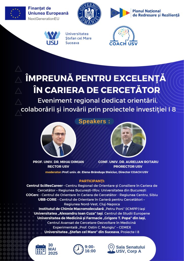 Dragi colegi, Avem deosebita plăcere de a vă invita să participați la evenimentul regional „COACH-USV: împreună pentru excelență în cariera de cercetător”, dedicat orientării, colaborării și inovării în cadrul proiectelor de cercetare finanțate prin Investiția 8 – PNRR. Evenimentul va avea loc vineri, 30 mai 2025, la Sala Senatului a Universității „Ștefan cel Mare” din Suceava (corp A, parter), în intervalul orar 09:00-16:00. Programul include prezentarea unor proiecte de cercetare inovatoare din cadrul universităților și institutelor partenere (ICMPP Iași, UAIC, UMF Iași, USV), precum și promovarea centrelor regionale pentru orientare și consiliere în cariera de cercetător din toată țara. Evenimentul este o oportunitate valoroasă de a intra în contact cu rețele de cercetare interdisciplinară, de a înțelege bune practici din proiectele PNRR și de a explora noi direcții de colaborare în carieră. Evenimentul se adresează cu precădere doctoranzilor, postdoctoranzilor și tinerilor cercetători, interesați de dezvoltarea profesională în domeniul cercetării științifice. Pentru participare, este necesară completarea formularului de înscriere disponibil la următorul link: https://forms.gle/AbD5tvua9iKjRbWb6 Programul detaliat este disponibil în atașament și cuprinde sesiuni de prezentări științifice. Vă rugăm să vă înscrieți cât mai curând, locurile fiind limitate – 40 de locuri. Cu considerație, Echipa COACH-USV Universitatea „Ștefan cel Mare” din Suceava