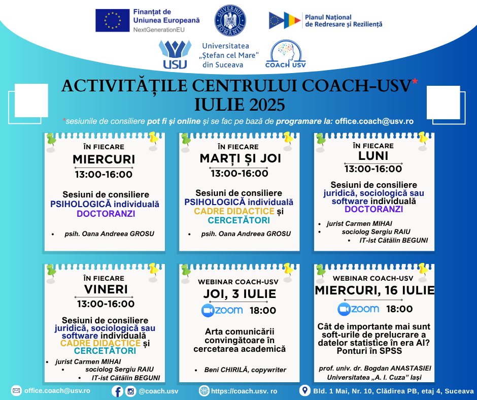 Centrul de Orientare, Asociere și Consiliere în Cariera de Cercetător (COACH-USV) din cadrul Universitatea „Ștefan cel Mare” din Suceava și care deservește întreaga Regiune de Dezvoltare NE a României vă așteaptă și în luna IULIE 2025 la sesiunile de consiliere sociologică, psihologică și juridică precum și la webinarele pe teme de cercetare organizate. Mulțumim!