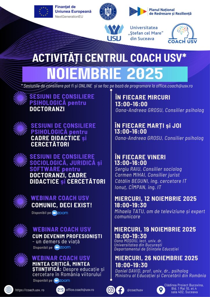 Centrul COACH USV-Centrul de Orientare, Asociere și Consiliere în Cariera de Cercetător de la Universitatea „Ștefan cel Mare” din Suceava continuă să susțină dezvoltarea personală și profesională a comunității academice din Regiunea de NE a României prin sesiuni de consiliere psihologică, sociologică, juridică și software, dar și prin webinarii dedicate creșterii și formării continue.