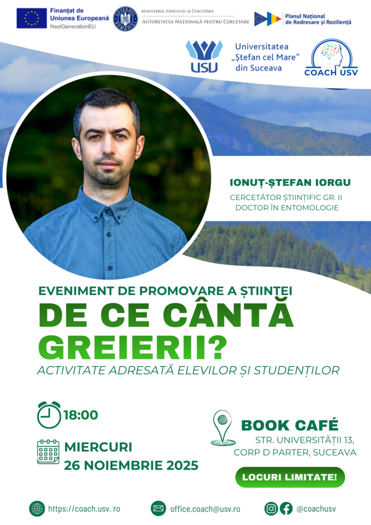 Cafeneaua Științei COACH-USV cu titlul: „De ce cântă greierii?”, susținută de CS gr. II dr. Ionuț-Ștefan Iorgu, cercetător științific, director proiect COACH USV și cadru didactic la Facultatea de Medicină și Științe Biologice a Universității „Ștefan cel Mare” din Suceava, a avut loc miercuri, 26 noiembrie 2025, ora 18:00, la Book Café-USV, și a reunit 59 de participanți, majoritatea fiind elevi și studenți, cu o participare consistentă a peste 50 de elevi de la Colegiul Național de Informatică „Spiru Haret” Suceava, alături de studenți interesați de biologie și entomologie. Prezentarea „De ce cântă greierii?” a adus știința mai aproape de tineri prin explicații clare, exemple vizuale și sunete reale ale insectelor, fiind percepută drept „liniștită, dar deloc plictisitoare”, „clară, politicos structurată” și „ușor de urmărit”, iar elevii au apreciat în special „sunetele ciudate” și „mulțimea de curiozități despre nevertebrate”, confirmând că dialogul direct dintre cercetători și tineri, într-un spațiu informal precum Cafeneaua Științei, stimulează curiozitatea științifică și apropierea de cercetare.