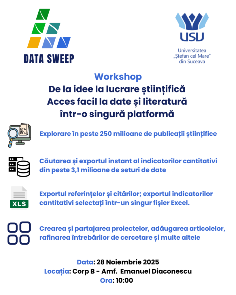 Cosmin-Alin Boțoroga, doctorand în anul IV cu experiență academică în patru țări, a prezentat, cu sprijinul Centrului COACH USV, în cadrul Universității „Ștefan cel Mare” din Suceava, platforma DATA SWEEP, proiect inițiat în februarie 2024 din nevoia de a accesa rapid bibliografie, date cantitative și rapoarte de cercetare, în cadrul workshopului „De la idee la lucrare științifică. Acces facil la date și literatură într-o singură platformă”, desfășurat vineri, 28 noiembrie 2025, la ora 10:00, în Amfiteatrul Emanuel Diaconescu (Corp B) și transmis online pe Zoom; în fața a peste 30 de participanți prezenți fizic și peste 20 conectați online, Cosmin-Alin Boțoroga a prezentat funcționalitățile platformei, de la căutarea în peste 250 de milioane de publicații științifice și explorarea a 3,1 milioane de seturi de date, până la exportul de citări, indicatori bibliometrici și date cantitative într-un singur fișier Excel, gestionarea articolelor, crearea și partajarea proiectelor și rafinarea întrebărilor de cercetare, conturând Data Sweep ca un instrument esențial pentru eficientizarea și profesionalizarea muncii de cercetare, demers susținut și de conf. univ. dr. Aurelian Rotaru, Prorector cu activitatea științifică, care a subliniat importanța soluțiilor digitale inovatoare pentru progresul cercetării universitare.