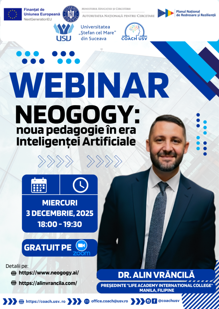Webinarul „Neogogy – noua pedagogie în era AI”, susținut de Dr. Alin Vrâncilă în cadrul platformei Coach USV – Universitatea „Ștefan cel Mare” din Suceava (program finanțat prin PNRR și NextGenerationEU), a reunit 139 de participanți interesați de transformările profunde ale educației în era inteligenței artificiale. Evenimentul a propus o schimbare de paradigmă, pornind de la ideea că universitățile trebuie să-și redefinească rolul social într-un context în care informația a devenit abundentă și gratuită prin AI. În această nouă ecologie educațională, valoarea centrală nu mai este conținutul, ci profesorul, relația pedagogică și capacitatea de a forma gândirea critică și autonomia intelectuală. Conceptul de Neogogy descrie o educație hiper-personalizată, în care AI funcționează ca tutor, iar cadrul didactic se concentrează pe sens, etică, dialog și formarea gândirii. Dr. Vrâncilă a avertizat asupra riscului „datoriei mintale”, atunci când studenții deleagă gândirea către AI și își pierd capacitatea de a reflecta independent. Într-o lume în care tehnologia poate produce rapid texte și soluții, adevărata raritate devine capacitatea de a simți, de a relaționa și de a gândi profund. Educația este redefinită ca un proces comunitar, inspirat de principiul Ubuntu – „eu exist pentru că tu exiști”. Feedback-ul participanților confirmă impactul mesajului: întâlnirea a fost percepută ca interesantă, captivantă, inspirațională și provocatoare, fiind apreciată pentru actualitatea temelor și utilitatea practică a ideilor prezentate, ceea ce indică o puternică rezonanță cu nevoile reale ale mediului academic contemporan.