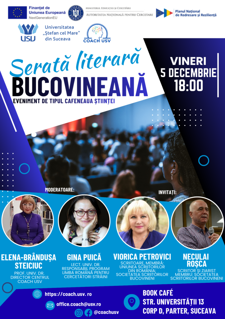 Serata literară bucovineană, eveniment de tip Cafeneaua Științei organizat de Centrul COACH USV al Universității „Ștefan cel Mare” din Suceava, a avut loc vineri, 5 decembrie 2025, la ora 18:00, la Book Café USV (Str. Universității 13, corp D, parter, Suceava) și a reunit 50 de participanți. În Ajun de Sfântul Nicolae, magia literaturii a animat spațiul într-o atmosferă caldă, pe acorduri discrete de colinde, unde dialogul viu a pus față în față două lumi ale scrisului – poezia și proza. Evenimentul a fost moderat de prof. univ. dr. Elena-Brândușa Steiciuc, director al Centrului COACH USV, și de lect. univ. dr. Gina Puică, responsabil al Programului de Limba Română pentru Cercetători Străini, care au ghidat cu eleganță și profunzime discuțiile despre creație, inspirație și limbaj artistic. Invitații serii, Viorica Petrovici, scriitoare și membră a Uniunii Scriitorilor din România și a Societății Scriitorilor Bucovineni, și Neculai Roșca, scriitor și ziarist, membru al Societății Scriitorilor Bucovineni, au adus în prim-plan volumele „Portal 16”, cu universul său „agravitațional” al emoțiilor și trăirilor profunde, și „Trecerea”, o meditație intensă asupra vieții, morții și sensului dintre ele. Dialogul a fost îmbogățit de lecturi, confesiuni și culise ale procesului de creație, iar liceenii claselor a X-a și a XII-a de la Colegiul Național „Mihai Eminescu” Suceava, însoțiți de profesoara Iacob Cezara Andreea, au descoperit direct de la autori cum se naște poezia și cum cuvântul devine artă. Prin această serată, COACH USV a creat un spațiu de întâlnire între tineri și cultură, oferindu-le curajul de a scrie și de a-și spune propriile povești.