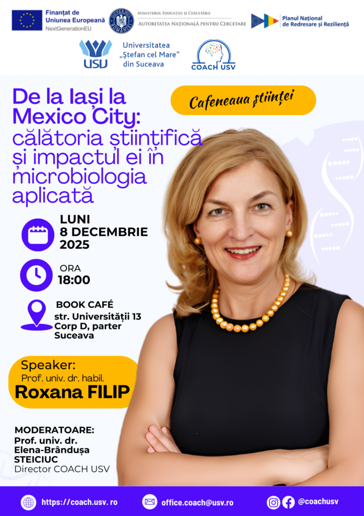 Cafeneaua Științei „De la Iași la Mexico City: călătoria științifică și impactul ei în microbiologia aplicată”, organizată de Centrul COACH USV al Universității „Ștefan cel Mare” din Suceava, a avut loc luni, 8 decembrie 2025, la ora 18:00, la Book Café USV (str. Universității 13, corp D, parter, Suceava) și a constituit o veritabilă doză de inspirație academică pentru publicul tânăr. Invitatul serii, prof. univ. dr. habil. Roxana Filip, responsabil de domeniu Medicină în cadrul COACH USV, a susținut o prezentare captivantă despre parcursul său științific internațional, de la Iași la Mexico City, despre motivația alegerii unei cariere academice în practica medicală și cercetare, rolul mentorilor și provocările fascinante ale microbiologiei, precum și despre ce înseamnă astăzi un doctorat în medicină. Evenimentul a fost moderat de prof. univ. dr. Elena-Brândușa Steiciuc, director COACH USV, care a facilitat un dialog deschis și interactiv. La întâlnire au participat elevi de la Colegiul Național „Petru Rareș” Suceava alături de studenți de anul II de la Facultatea de Medicină și Științe Biologice, viitori medici care au împărtășit experiențe autentice din viața universitară, din activitatea asociațiilor studențești și din laboratoare, invitându-i pe liceeni să experimenteze direct viața de facultate. Atmosfera a fost completată de prezența studenților de la Facultatea de Istorie, Geografie și Științe Sociale – Resurse Umane, Facultatea de Drept și Științe Administrative, Facultatea de Economie, Administrație și Afaceri și Facultatea de Litere și Științe ale Comunicării, conturând o comunitate academică diversă și efervescentă. Dialogul, energia și curiozitatea participanților au transformat această Cafenea a Științei într-un spațiu viu de întâlnire între liceeni, studenți și cercetare, unde știința a devenit pasiune și orientare de carieră.