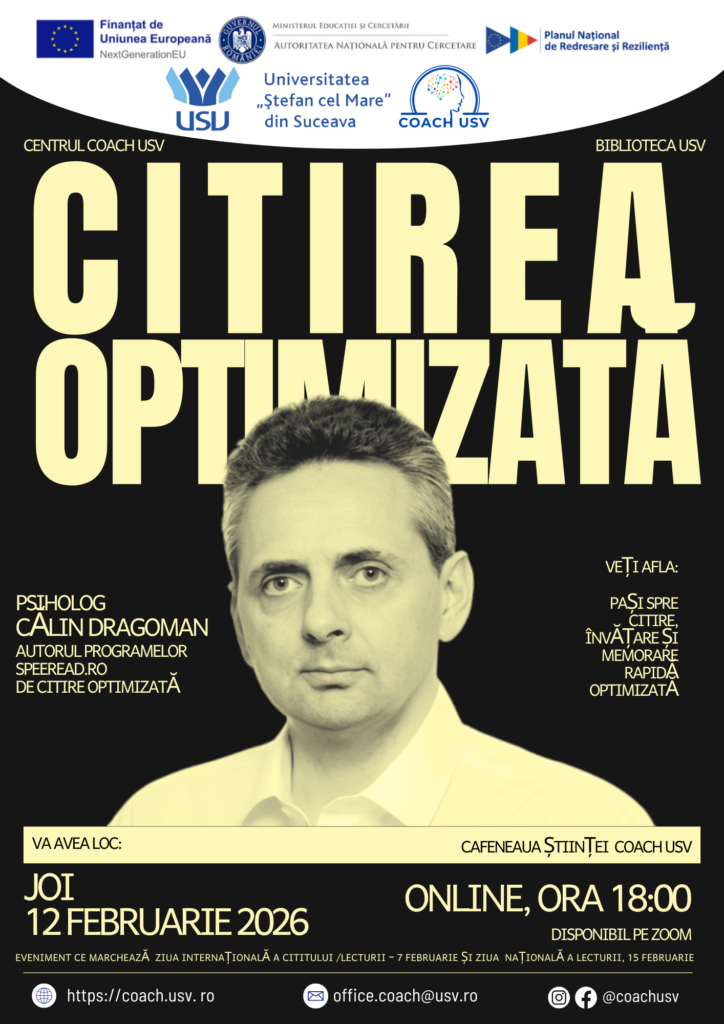 În data de 12 februarie 2026, COACH USV, a organizat un nou webinar din seria „Cafeneaua Științei”, organizat de Universitatea „Ștefan cel Mare” din Suceava, în parteneriat cu Biblioteca USV. Evenimentul s-a desfășurat online și l-a avut ca invitat pe psihologul Călin Dragoman, cunoscut pentru programele sale dedicate citirii optimizate și dezvoltării cognitive. Întâlnirea a fost organizată în contextul marcării Zilei Internaționale a Cititului și a Zilei Naționale a Lecturii, având ca temă principală optimizarea procesului de citire și învățare. În deschiderea sesiunii, moderatorul a subliniat importanța dezvoltării competențelor de lectură în societatea actuală, caracterizată de un volum tot mai mare de informație. Invitatul a prezentat conceptul de „citire optimizată”, explicând modul în care aceasta poate crește semnificativ viteza de citire și capacitatea de înțelegere, prin antrenarea coordonată a atenției, a ochilor și a proceselor cognitive . Pe parcursul intervenției, au fost detaliate fundamentele științifice ale metodei propuse, fiind evidențiat faptul că citirea tradițională, de aproximativ 200–250 de cuvinte pe minut, poate fi depășită prin exerciții sistematice. Invitatul a explicat că, prin antrenament zilnic, viteza de citire poate crește considerabil, ajungând chiar la 900–1000 de cuvinte pe minut, fără a afecta înțelegerea, ci dimpotrivă, îmbunătățind-o . De asemenea, a fost discutat rolul excesului informațional în societatea contemporană și nevoia de a dezvolta strategii eficiente de selecție și asimilare a informației relevante. Un alt aspect important al discuției a vizat dimensiunea practică a metodei, fiind prezentată platforma de antrenament dezvoltată de invitat. Participanții au aflat cum pot evalua viteza de citire și memoria, dar și cum pot urma un program structurat de exerciții zilnice, adaptat vârstei și nivelului de experiență. S-a subliniat că rezultatele depind de consecvența antrenamentului, iar beneficiile includ nu doar economisirea timpului, ci și creșterea motivației pentru lectură și învățare. În partea finală, sesiunea de întrebări și răspunsuri a deschis un dialog aplicat despre raportul dintre citirea rapidă și înțelegerea profundă, despre rolul gândirii critice și despre diferențele de performanță în funcție de domeniul de cunoaștere. Concluzia generală a fost că optimizarea citirii nu reduce calitatea experienței intelectuale, ci o amplifică, oferind participanților instrumente concrete pentru a face față mai eficient provocărilor educaționale și profesionale actuale.